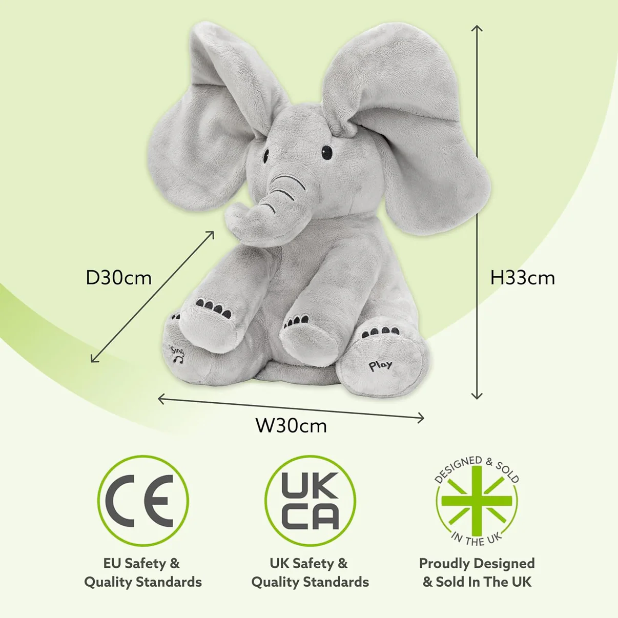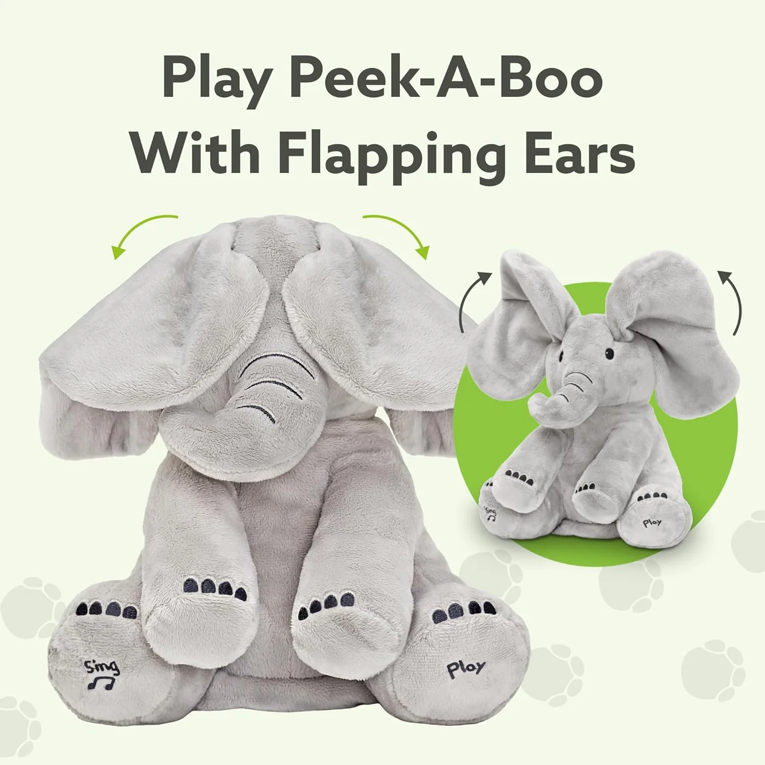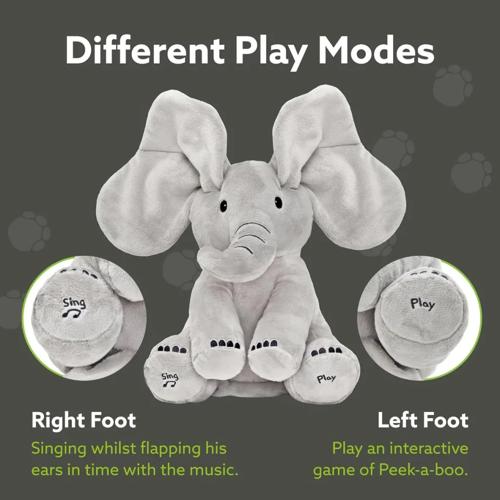 INTERACTIVE PLAY: Press Flappy’s left foot to engage in a game of peek-a-boo, where Flappy hides behind his oversized ears. Press his right foot to hear a playful new song in a child’s voice while his ears flap to the rhythm Song styles may vary
